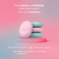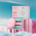 São 4 sabonetes sortidos com duas cores, azul e rosa, em uma nuvem de benefícios: