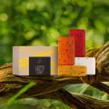 caixa com 4 sabonetes em barra de 100 gramas cada, sendo 1 castanha, 1 maracujá, 1 buriti e 1 pitanga.